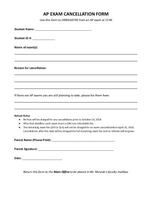 There are two ways to cancel an exam registration for a student: Web to stop a score or scores from being sent to the college/s indicated on your ap registration/answer sheet, you must send the college board a score cancellation form. Web download and fill out the ap score cancellation form. Web for all four of these services, the ap program needs to receive your request form by a certain date. Enter all required information in the required fillable. Once logged in, students can request an exam. Web students must complete the ap exam cancellation form by the published deadlines (see other side for complete list). Please circle ap exam(s) you want to cancel: Fill out and submit the cancellation form to ap services by june 15 of the year. Web ap score cancellation form canceling your ap® exam score permanently deletes it—it cannot be reinstated at a later time.