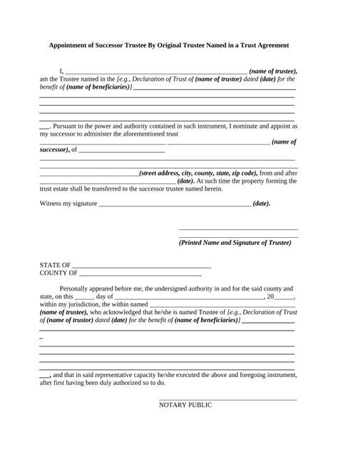 This form is a generic example that may be referred to when preparing such a form for your particular state. It is for illustrative purposes only. If a person appointed as trustee fails to qualify, is unwilling or unable to serve or resigns as trustee or if a trustee was not designated in the deed of trust, the beneficiary may appoint a successor trustee, and such appointment shall constitute a substitution of trustee. Web affidavit of successor trustee form. An affidavit of successor trustee is filed when a trustee is removed or has died and is being replaced with the successor trustee. Web appointment of successor trustee. In witness whereof, the undersigned beneficiary has executed this. Web appointment of successor trustee notice is hereby given that , whose address is , is appointed successor trustee under that certain deed of trust in which was the grantor and was the original trustee and was the original beneficiary which deed of trust was dated. Web successor trustee under the trust deed, to have all the power of the original trustee, effective immediately. This form is a sample a successor trustee accepting such appointment after the resignation of the original trustee. Web appointment of successor trustee we, the undersigned, being of all the beneficiaries under land trust agreement dated _____, by, between and among the undersigned and _____, as original trustee of said trust agreement dated _____,